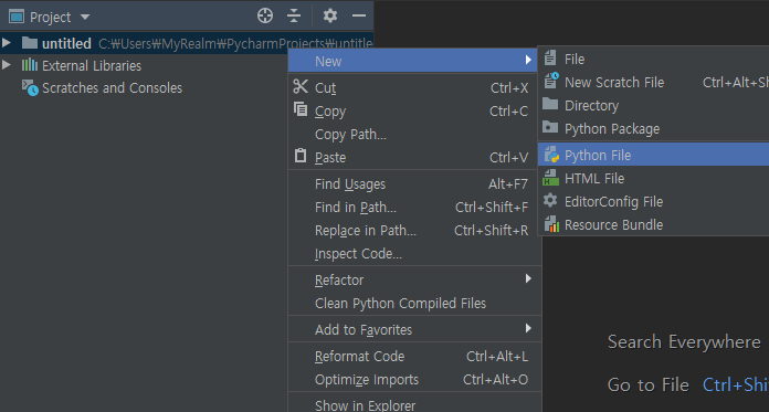 프로젝트 우클릭 > New > Python File을 누른 뒤