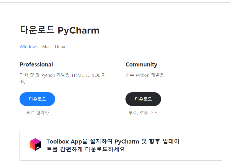 먼저 아래 링크를 누르면 위 스크린샷과 같은 파이참 설치 화면이 뜨는데