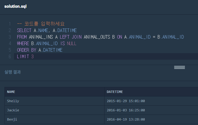 먼저 LEFT JOIN과 WHERE 문에 B.ANIMAL_ID IS NULL을 넣어