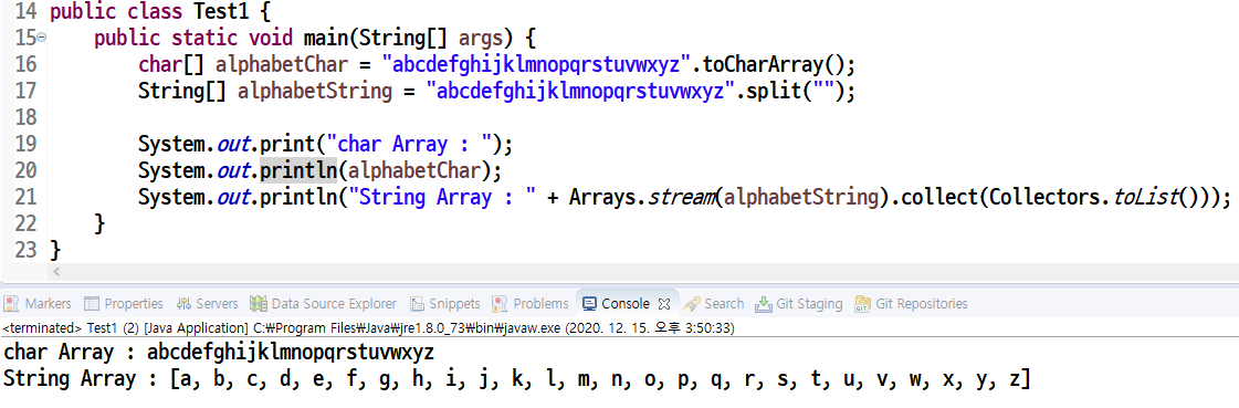 자바에서 알파벳 한 글자씩 char String 타입의 배열로 넣으려 하는 경우에는