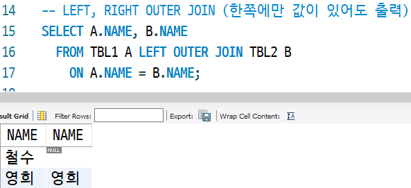 TBL2에는 '철수'라는 값이 없어도 TBL1에 있기 때문에