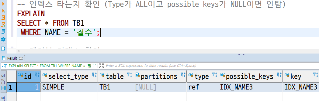 -- 인덱스 타는지 확인 (Type가 ALL이고 possible keys가 NULL이면 안탐)