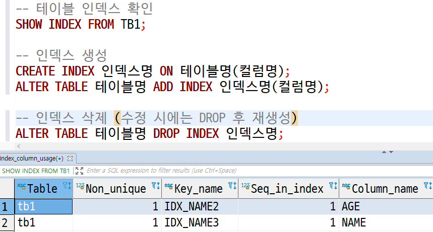 SHOW INDEX FROM 테이블명;