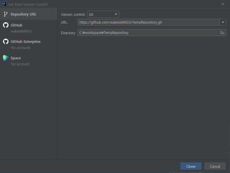 URL에 아까 그 주소를 붙여넣고 Clone을 눌러주면