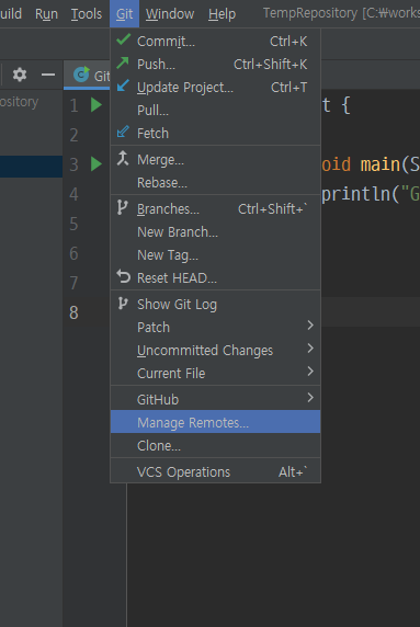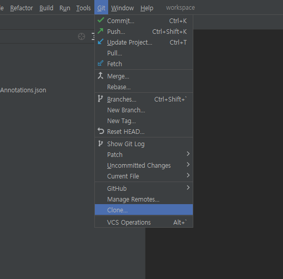 다음으로 인텔리제이에서 Git > Clone을 누른 뒤